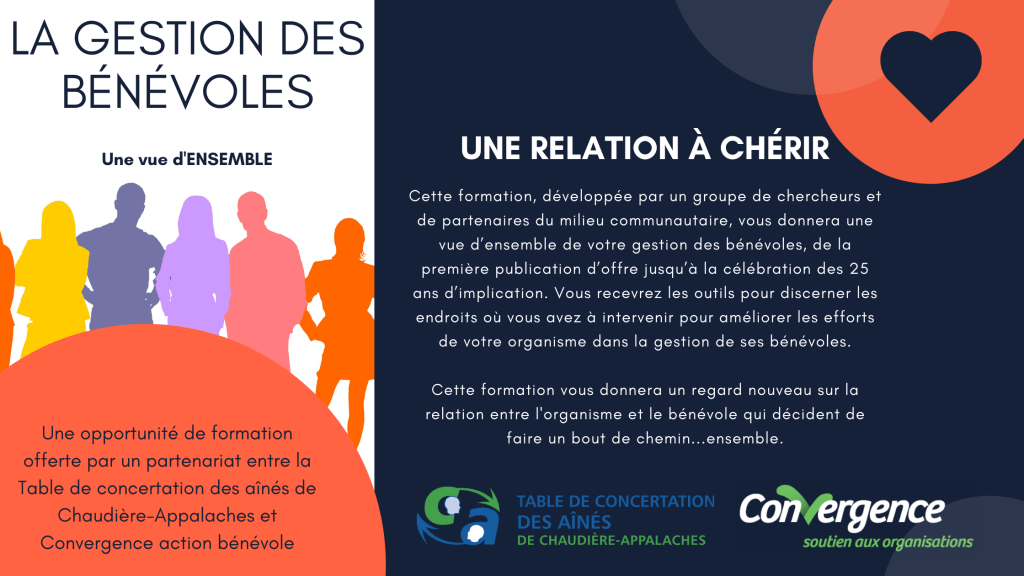 Bonne nouvelle !!! Une formation en GESTION DES BÉNÉVOLES, sera offerte par la Table de concertation des aînés de Chaudière-Appalaches dans les prochaines semaines.