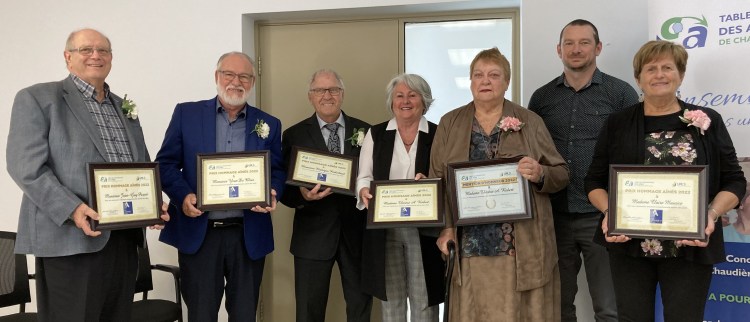 De gauche à droite : M. Jean-Guy Parent, M. Yvan De Blois, M. Rodrigue Robichaud, Mme Nicole Champagne – présidente TCA-CA tenant le certificat PHA de Mme Robert, Mme Thérèse A. Robert – mention d’honneur, M. Dave Fortin – directeur général URLS, Mme Claire Maurice. Photo – Mme Julie Forgues.